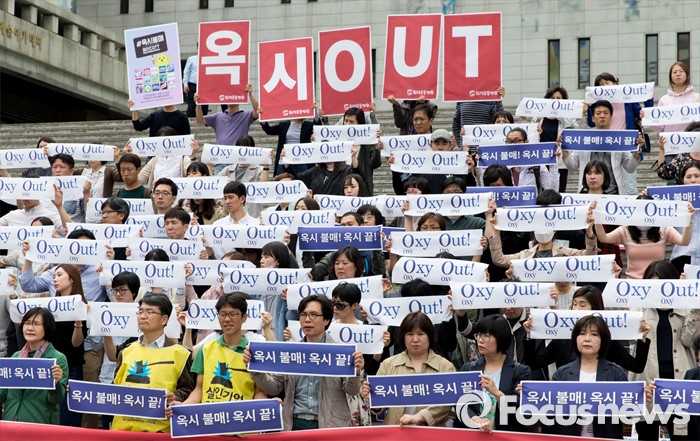 (서울=포커스뉴스) 9일 오후 서울 종로구 세종문화회관 앞 계단에서 환경운동연합 및 시민사회단체들이 옥시 불매 집중 행동 돌입선언 기자회견을 하고 있다.