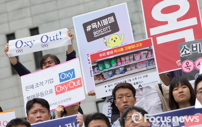 (서울=포커스뉴스) 9일 오후 서울 종로구 세종문화회관 앞 계단에서 환경운동연합 및 시민사회단체들이 옥시 불매 집중 행동 돌입선언 기자회견을 하고 있다.