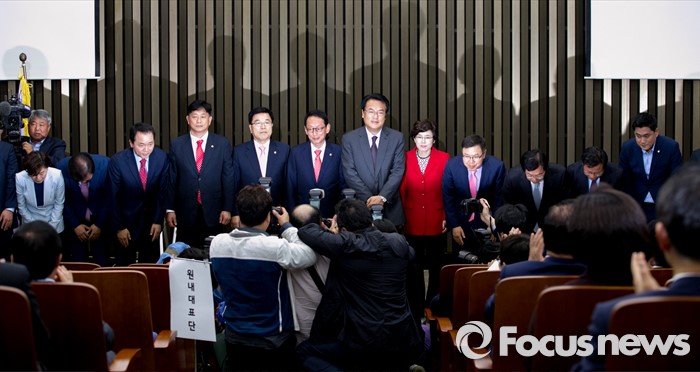 (서울=포커스뉴스) 정진석 새누리당 원내대표 등 신임 원내대표단이 9일 오후 서울 여의도 국회에서 열린 20대 총선 당선자 총회에 참석해 인사하고 있다.