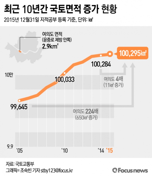 (서울=포커스뉴스) 우리나라 국토면적이 1년 동안 여의도 면적의 4배인 11㎢가 증가한 것으로 나타났다