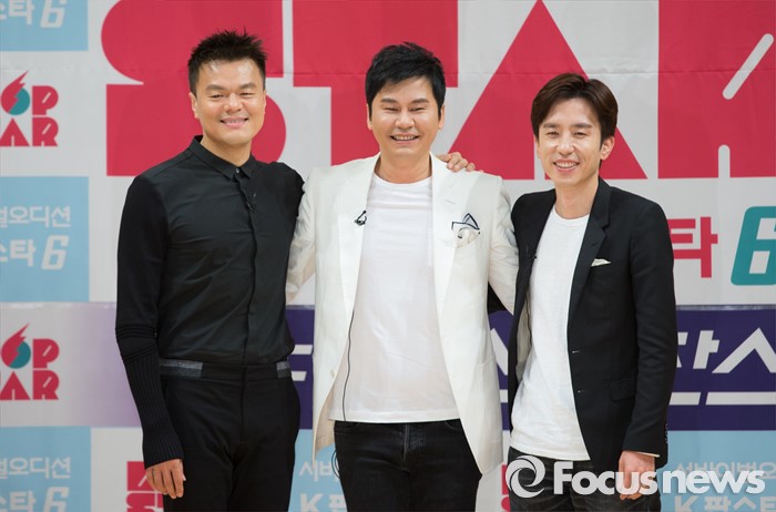 (서울=포커스뉴스) 9일 오후 서울 양천구 SBS 목동사옥에서 열린 '서바이벌 오디션 K팝스타 시즌6' 제작발표회에 참석한 심사위원 박진영(왼쪽부터), 양현석, 유희열이 포토타임을 갖고 있다.