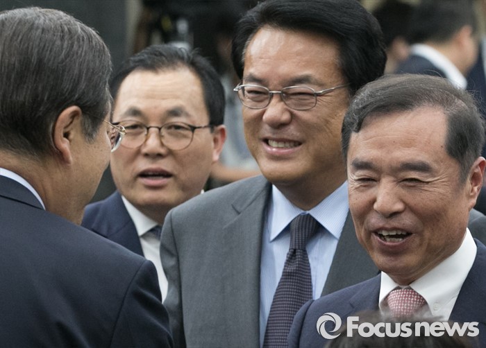 (서울=포커스뉴스) 9일 오후 서울 여의도 국회에서 열린 새누리당 20대 총선 당선자 총회에 참석한 정진석(가운데) 원내대표와 특강자로 나선 노무현 정부 청와대 정책실장 출신 김병준(오른쪽) 국민대 교수가 참석자들과 인사하고 있다.