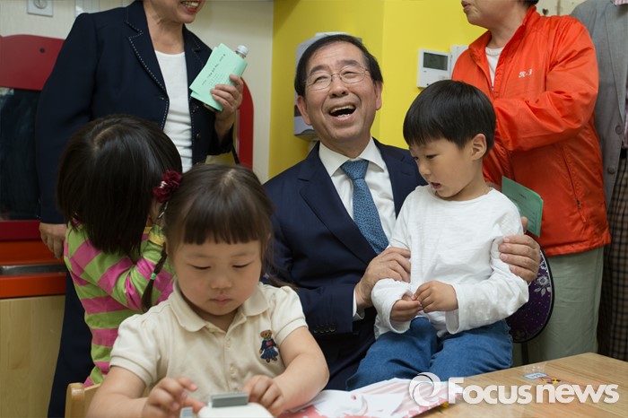 (서울=포커스뉴스) 박원순 서울시장이 9일 오후 서울 성동구 송정햇살어린이집에서 열린 서울시 1000번째 국공립어린이집 개원식을 마친 뒤 어린이들과 시간을 보내고 있다.