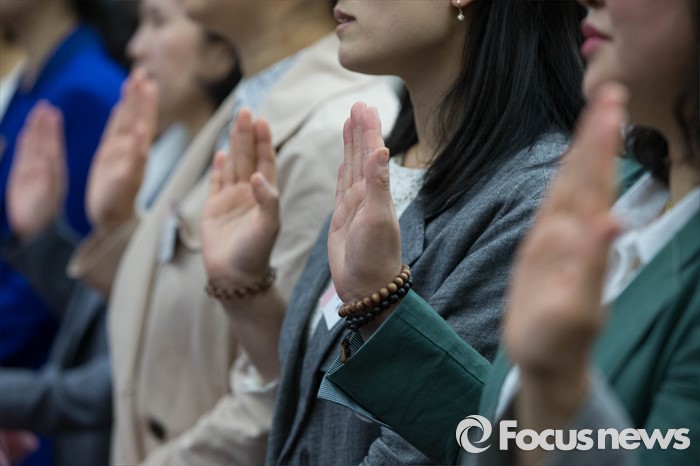 (서울=포커스뉴스) 9일 오후 서울 송파구 아이코리아에서 열린 '보육교직원 결의대회'에 참석한 보육관계자들이 보육인 윤리선언을 하고 있다.