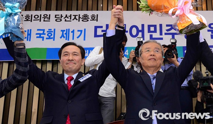 광주에서 열리는 더민주의 당선자 워크숍이 호남 민심에 어떤 영향을 미칠지 정치권의 관심이 쏠린다.김종인(오른쪽) 더불어민주당 비대위 대표와 우상호 원내대표가 취재진을 향해 포즈를 취하고 있다. 2016.05.04 강진형 기자