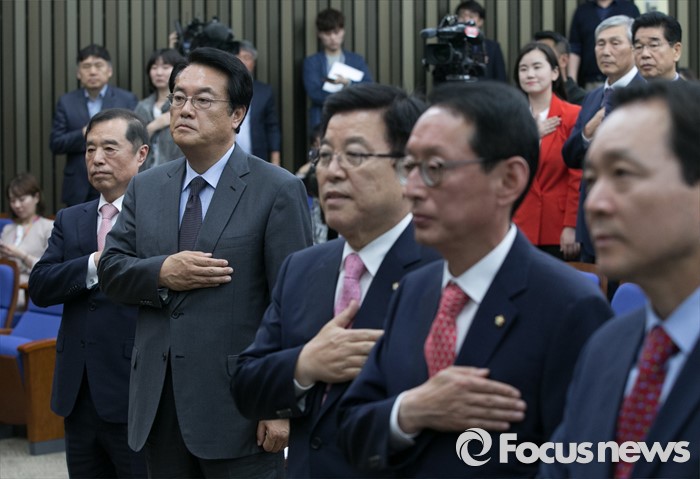 정 원내대표는 "전당대회에 대해서는 7월을 넘기지 않고 그 안에 치러야겠다는 한가지 기준을 제시했고, 그걸 기준으로 비대위 구성이라든가 혁신비대위든 쇄신비대위든 그냥 비대위든 비대위 구성 노력하고, 비대위 책임질 인사를 영입하는 문제에 속도를 내서 추진하겠다"고 밝혔다.