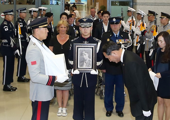 (서울=포커스뉴스) 박승춘 국가보훈처장이 9일 오후 인천국제공항에 도착한 6.25전쟁 네덜란드 참전용사 故 니콜라스 프란스 웨셀(Nicolas Frans Wessels)씨의 유해를 향해 고개를 숙이고 있다. 6·25전쟁에 네덜란드 반호이츠 부대원(일병)으로 참전한 故 니콜라스 프란스 웨셀씨는 1953년 11월에 한국을 떠났지만 자신이 목숨바쳐 지켰던 한국에 대한 애정이 아주 컸으며, 평소 부산 UN기념공원에 묻힌 전우들을 그리워하다 지난해 4월 7일 "한국에 있는 전우들 곁에 잠들게 해 달라"는 유언을 남긴 채 향년 84세의 일기로 삶을 마감했다. 지난해 5월 부산 UN기념공원에 프랑스 참전용사 故 레몽 베나르씨가 사후 안장 실시된 이후 4번째인 웨셀 씨는 오는 12일 오전 부산UN기념공원에 안장된다. <사진제공=국가보훈처>