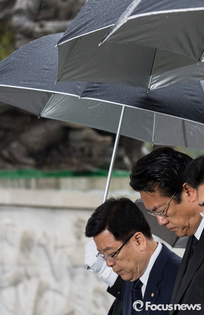 (서울=포커스뉴스) 10일 오전 서울 동작구 국립현충원을 찾은 정진석(오른쪽) 새누리당 신임 원내대표와 김광림 신임 정책위의장이 묵념하고 있다.