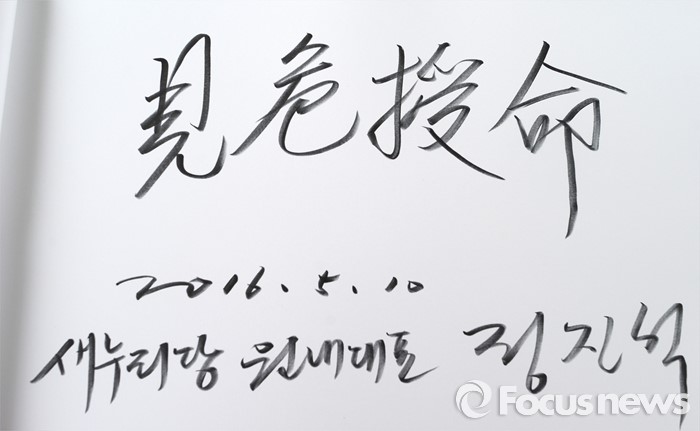 (서울=포커스뉴스) 10일 오전 서울 동작구 국립현충원을 찾은 정진석 새누리당 신임 원내대표가 참배 후 작성한 방명록에 견위수명(나라의 위태로운 지경을 보고 목숨을 바친다)이 적혀 있다.