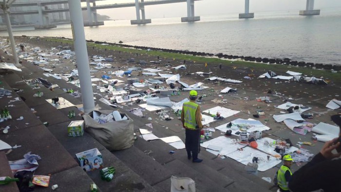 사진에는 돗자리와 음식물 쓰레기, 술병들이 뒹구는 모습이 담겨있다.