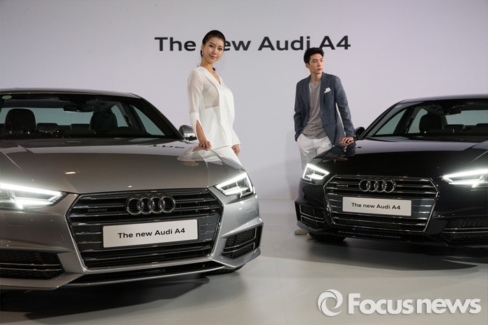 (서울=포커스뉴스) 10일 오전 서울 중구 반얀트리 클럽 앤 스파에서 모델들이 준중형 세단 '뉴 아우디 A4'를 선보이고 있다. '뉴 아우디 A4'는 기존 모델보다 무게가 최대 100kg까지 감량, 최고 출력 252마력, 최대 토크 38.0kg·m, 연비는 복합연비 기준 11.6km이다.