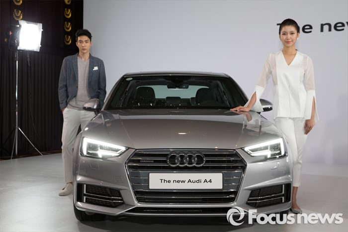 (서울=포커스뉴스) 10일 오전 서울 중구 반얀트리 클럽 앤 스파에서 모델들이 준중형 세단 '뉴 아우디 A4'를 선보이고 있다. '뉴 아우디 A4'는 기존 모델보다 무게가 최대 100kg까지 감량, 최고 출력 252마력, 최대 토크 38.0kg·m, 연비는 복합연비 기준 11.6km이다.