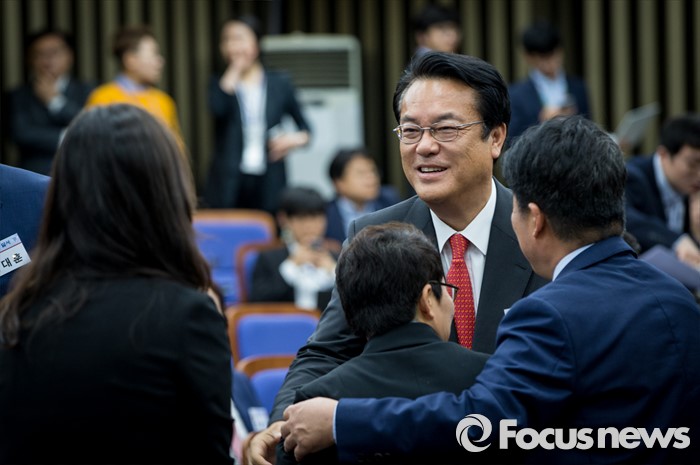 (서울=포커스뉴스) 10일 오전 서울 여의도 국회에서 열린 새누리당 제20대 국회 초선의원 연찬회에 참석한 정진석 신임 원내대표가 초선의원들과 인사하고 있다.