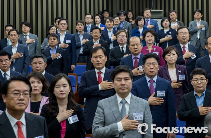(서울=포커스뉴스) 10일 오전 서울 여의도 국회에서 열린 새누리당 제20대 국회 초선의원 연찬회에 참석한 초선 의원들이 국민의례를 하고 있다.