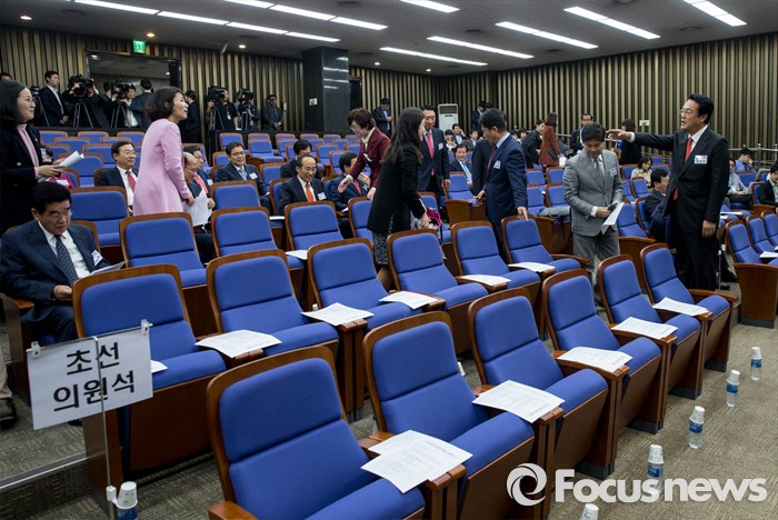 (서울=포커스뉴스) 10일 오전 서울 여의도 국회에서 열린 새누리당 제20대 국회 초선의원 연찬회에 참석한 정진석 신임 원내대표가 초선의원들에게 앞 줄부터 앉을 것을 권하고 있다.