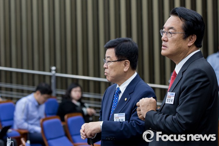 (서울=포커스뉴스) 10일 오전 서울 여의도 국회에서 열린 새누리당 제20대 국회 초선의원 연찬회에 참석한 정진석(맨 오른쪽) 신임 원내대표와 김광림 신임 정책위의장이 생각에 잠겨 있다.