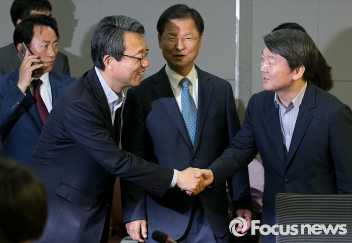 (서울=포커스뉴스) 안철수(오른쪽) 국민의당 상임공동대표와 김성식(왼쪽) 정책위의장이 10일 오전 서울 여의도 국회 의원회관에서 열린 당선자 총회 및 3차 집중워크숍에 참석해 인사하고 있다. 가운데는 천정배 공동대표.