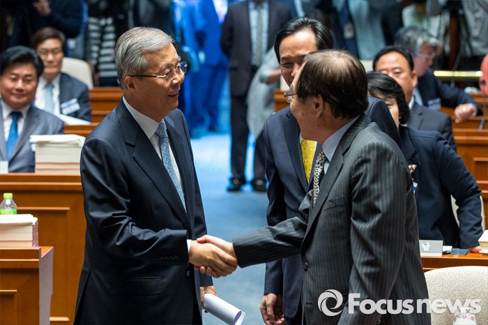 (서울=포커스뉴스) 김종인(왼쪽) 더불어민주당 비상대책 위원장이 10일 오전 서울 여의도 국회에서 열린 초선 당선자 워크숍에 강연자로 나선 임채정 전 국회의장과 악수하고 있다.