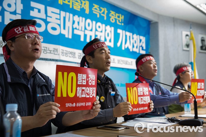 (서울=포커스뉴스) 10일 오전 서울 영등포구 한국노총회관에서 열린 '양대노총 공공부문 공대위 기자회견'에 참석한 공동위원장들이 정부의 해고연봉제, 강제퇴출제, 불법 강압에 반대하며 구호를 외치고 있다.