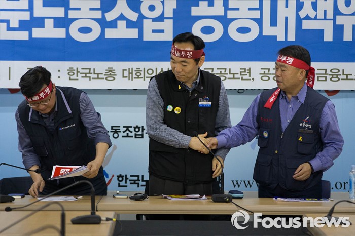 (서울=포커스뉴스) 10일 오전 서울 영등포구 한국노총회관에서 열린 '양대노총 공공부문 공대위 기자회견'에 참석한 공동위원장들이 악수를 나누고 있다.