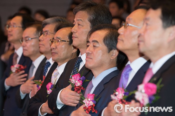 (과천=포커스뉴스) 10일 오전 경기도 과천시민회관에서 열린 '제5회 유권자의 날 기념식'에서 이인복(오른쪽 네번째) 중앙선거관리위원장이 국기에 대한 경례를 하고 있다.
