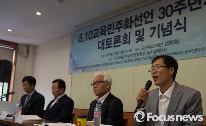 (서울=포커스뉴스) 10일 오후 서울 중구 프란치스코회관 강당에서 열린 '5.10 교육민주화선언 30주년기념 대토론회 및 기념식'에 참석한 김학한(오른쪽) 참교육연구소장이 인사말을 하고 있다.