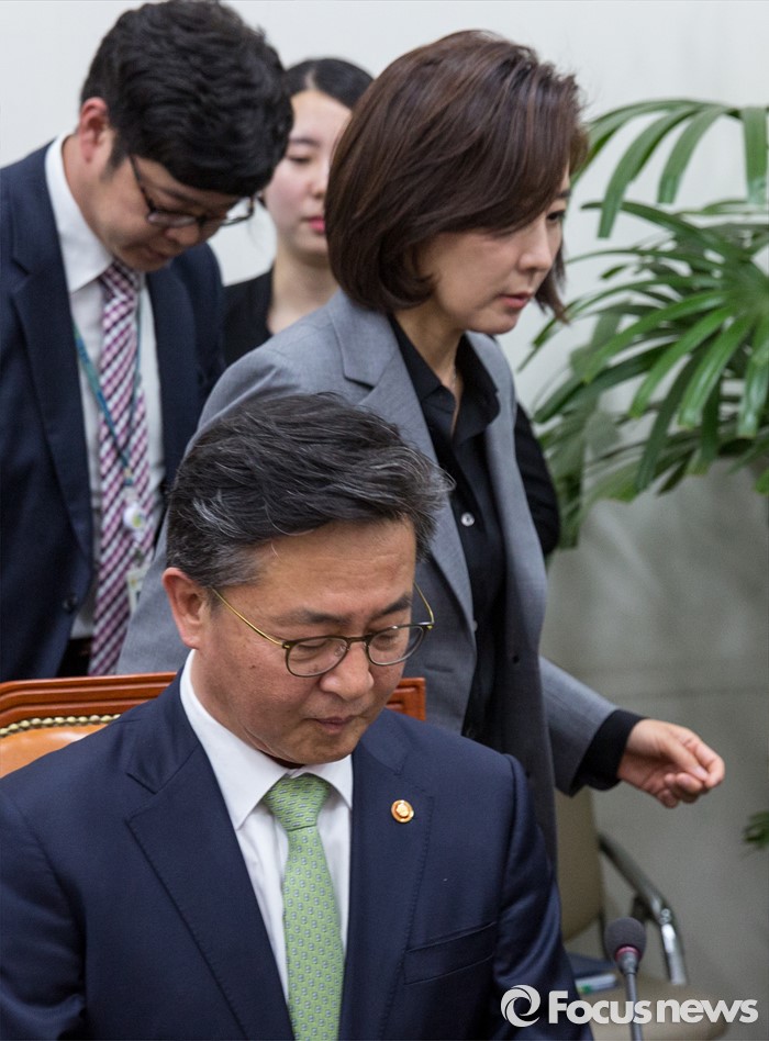 (서울=포커스뉴스) 나경원 국회 외교통일위원장과 홍용표 통일부 장관이 10일 오후 서울 여의도 국회에서 열린 외교통일위원회 간담회에 참석하기 위해 회의실로 들어서고 있다.