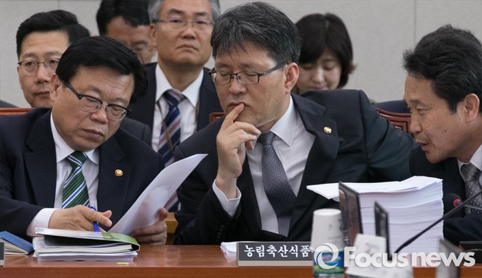 (서울=포커스뉴스) 10일 오후 서울 여의도 국회에서 농림축산식품해양수산위원회 전체회의에 앞서 이동필(왼쪽부터) 농림축산식품부 장관, 여인홍 차관, 이양호 농촌진흥청장이 대화하고 있다. 이날 회의는 세월호 특별법 개정안 내용 중 특조위 활동 기간 연장과 관련 이견 등으로 여당 의원들이 불참한 채 진행됐다.