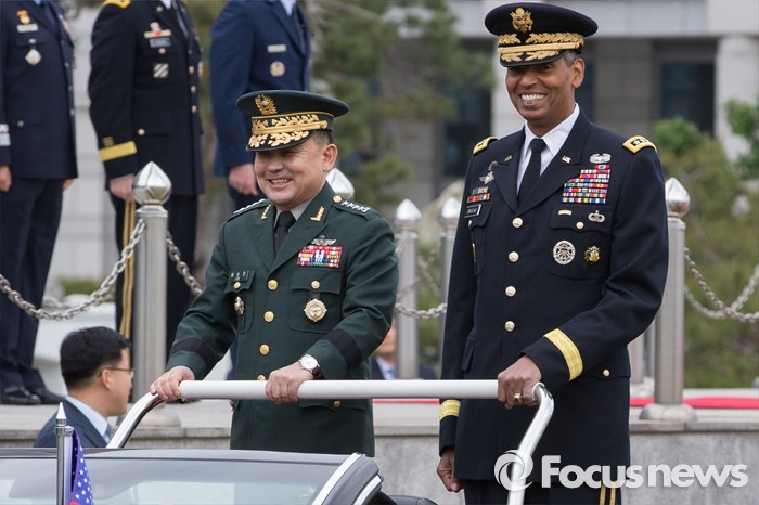 (서울=포커스뉴스) 10일 오후 서울 용산구 합동참모본부 대연병장에서 열린 환영 의장행사에서 빈센트 브룩스(왼쪽) 신임 한·미연합사령관 겸 주한미군사령관과 이순진 합참의장이 의장대 사열을 하고 있다.
