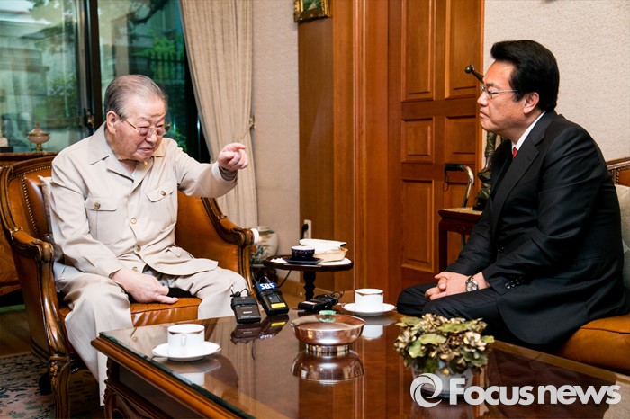 (서울=포커스뉴스) 정진석(오른쪽) 새누리당 원내대표가 10일 오후 서울 중구 김종필 전 총리 자택을 방문해 김 전 총리와 환담을 하고 있다.