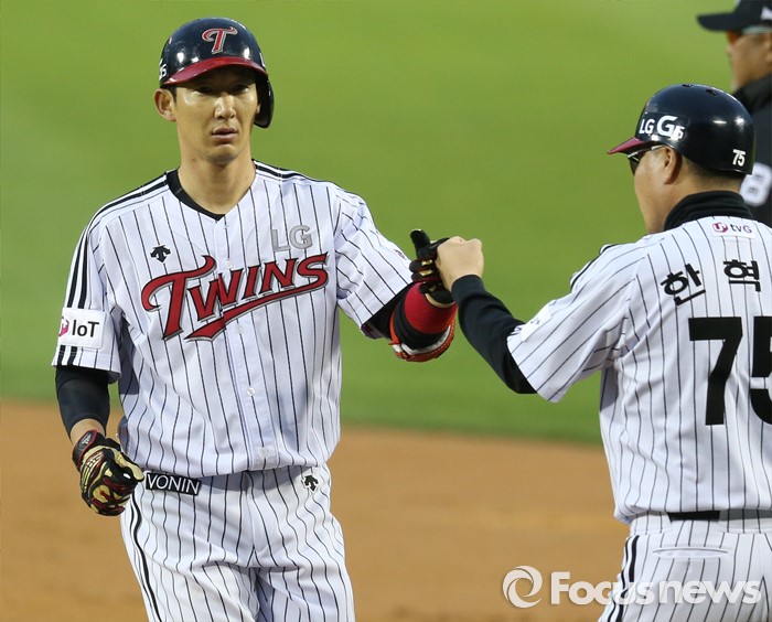 (서울=포커스뉴스) 10일 서울 잠실구장에서 열린 2016 프로야구 삼성-LG 경기 2회말 1사 1,2루에서 LG 손주인이 1타점 좌중간 안타를 치고 한혁수 코치의 환영을 받고 있다.
