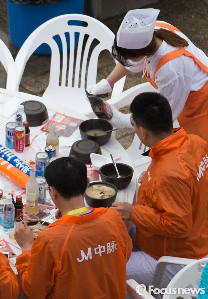 (서울=포커스뉴스) 10일 오후 서울 서초구 반포한강공원에서 열린 삼계탕 만찬에서 한 관계자가 중국 건강보조제품 회사 중마이과기발전유한공사 소속 임직원들에게 삼계탕을 나눠주고 있다.