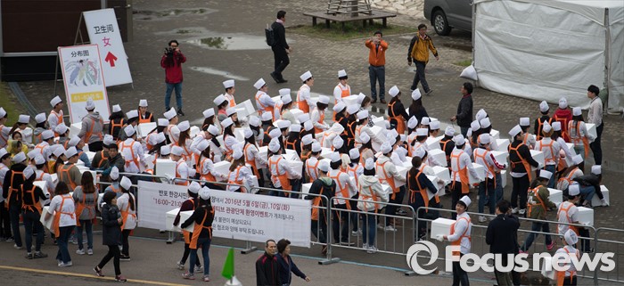 (서울=포커스뉴스) 10일 오후 서울 서초구 반포한강공원에서 열린 삼계탕 만찬에서 행사 관계자들이 중국 건강보조제품 회사 중마이과기발전유한공사 소속 임직원들이 먹을 삼계탕을 나르고 있다.