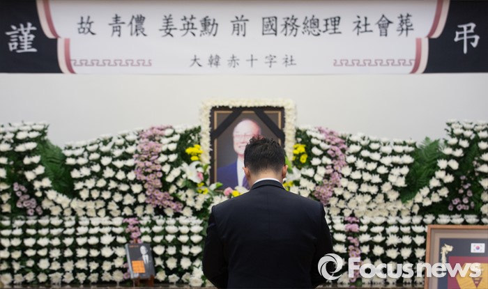 (서울=포커스뉴스) 10일 오후 서울 송파구 서울아산병원 장례식장에 마련된 故 강영훈 전 국무총리의 빈소에서 한 조문객이 조문하고 있다.