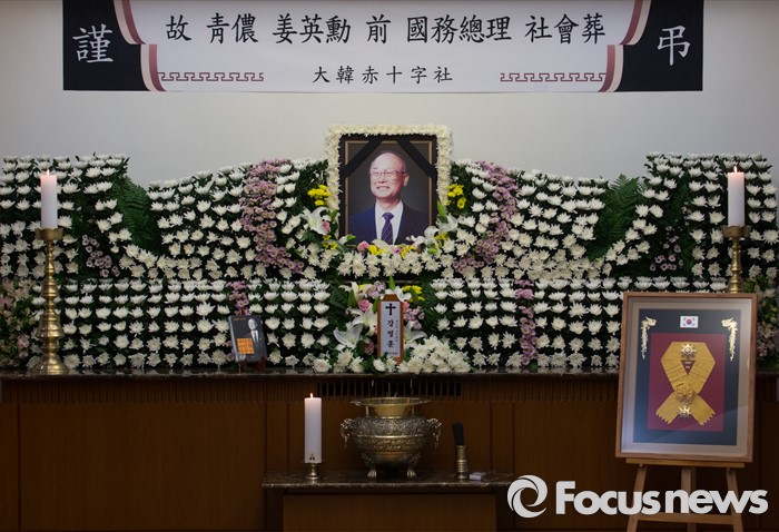 (서울=포커스뉴스) 10일 오후 서울 송파구 서울아산병원 장례식장에 마련된 故 강영훈 전 국무총리의 빈소에 고인의 영정이 놓여있다.