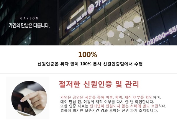 11일 가연결혼정보(이하 가연)에 따르면, 신원인증을 별도로 전담하는 '신원인증팀'을 운영해 재혼을 초혼으로 위장하거나, 위조된 신분으로 결혼정보회사에 가입하려는 사례를 방지하고 있다.