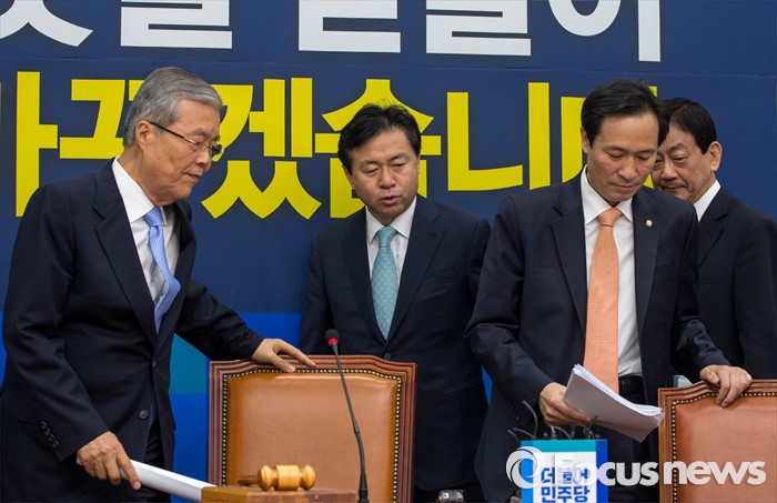 (서울=포커스뉴스) 김종인(왼쪽) 더불어민주당 비상대책위 대표와 우상호(오른쪽 두 번째) 원내대표를 비롯한 위원들이 11일 오전 서울 여의도 국회에서 열린 비상대책위원회의에 참석하기 위해 회의실로 들어서고 있다.
