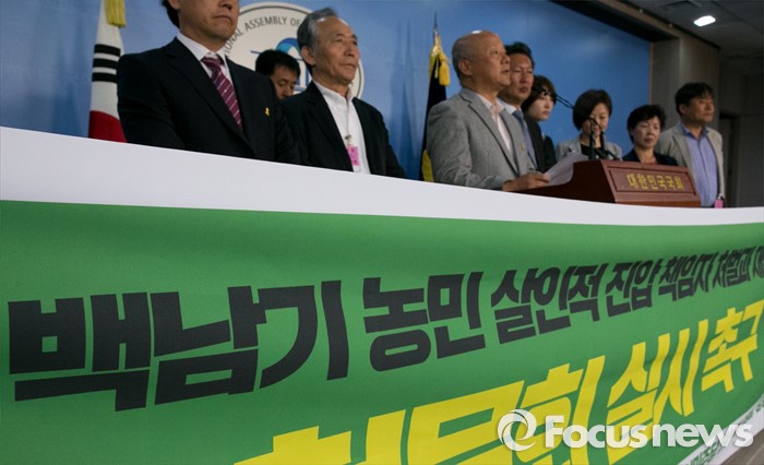 (서울=포커스뉴스) 정청래, 진선미 더불어민주당 의원과 백남기대책위 관계자들이 11일 오전 서울 여의도 국회 정론관에서 백남기 농민 진압 책임자 처벌과 재발방지를 위한 국회 청문회 실시 촉구 기자회견을 하고 있다.