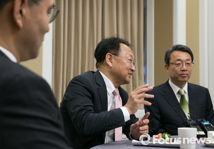 (서울=포커스뉴스) 김성식(오른쪽) 국민의당 정책위의장이 11일 오전 서울 여의도 국회 귀빈식당에서 유일호(가운데) 경제부총리 겸 기획재정부 장관을 만나 면담을 하고 있다.