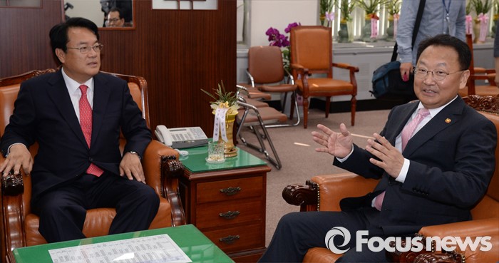 (서울=포커스뉴스) 정진석(왼쪽) 새누리당 원내대표가 11일 오전 서울 여의도 국회를 방문한 유일호 경제부총리 겸 기획재정부 장관과 면담을 하고 있다.