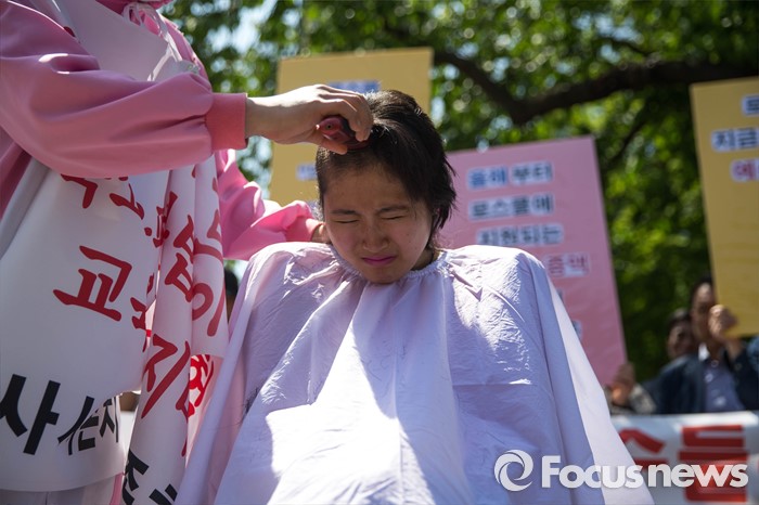 (서울=포커스뉴스) 11일 오전 서울 관악구 서울대학교 앞에서 사시존치를위한고시생모임 회원 황지나씨가 교육부의 전수조사 결과 발표를 규탄하며 삭발식을 하고 있다.