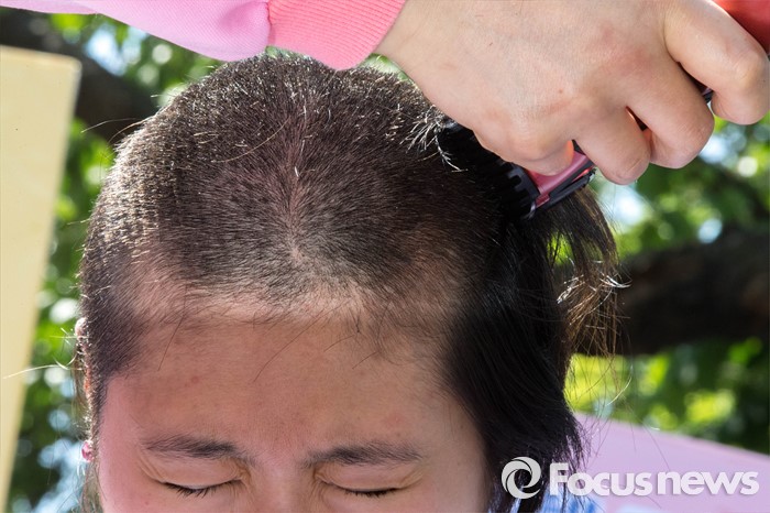 (서울=포커스뉴스) 11일 오전 서울 관악구 서울대학교 앞에서 사시존치를위한고시생모임 회원 황지나씨가 교육부의 전수조사 결과 발표를 규탄하며 삭발식을 하고 있다.