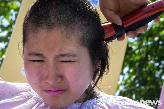 (서울=포커스뉴스) 11일 오전 서울 관악구 서울대학교 앞에서 사시존치를위한고시생모임 회원 황지나씨가 교육부의 전수조사 결과 발표를 규탄하며 삭발식을 하고 있다.