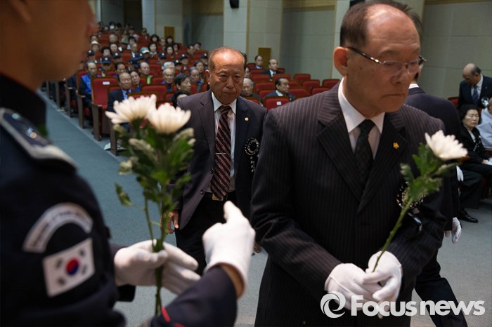 (서울=포커스뉴스) 11일 오전 서울 동작구 국립현충원에서 열린 '철기 이범석 장군 제44주기 추모제' 참석자들이 헌화 및 분향하고 있다.