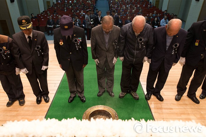 (서울=포커스뉴스) 11일 오전 서울 동작구 국립현충원에서 열린 '철기 이범석 장군 제44주기 추모제' 참석자들이 헌화 및 분향하고 있다.