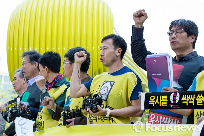 (서울=포커스뉴스)영국과 덴마크에서 옥시레킷벤키저 본사와 케톡스 본사를 항의 방문했던 가습기 살균제 피해자 유족과 시민단체가 11일 오후 서울 영등포구 여의도 옥시 한국본사 앞에서 열린 귀국 기자회견에 참석해 옥시를 규탄하는 구호를 외치고 있다.
