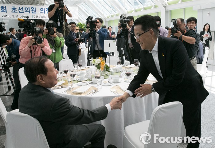 (서울=포커스뉴스) 11일 오후 서울 여의도 국회 의원회관에서 열린 20대 국회 초선의원 의정연찬회 오찬에 참석한 김원기(왼쪽) 전 국회의장과 박지원 국민의당 원내대표가 인사하고 있다.
