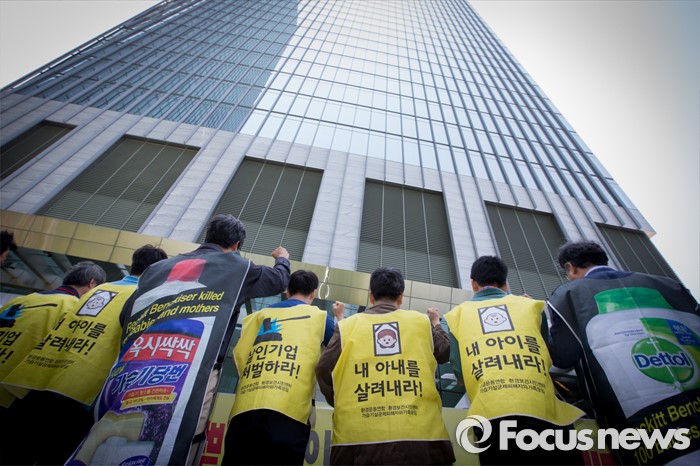 (서울=포커스뉴스)영국과 덴마크에서 옥시레킷벤키저 본사와 케톡스 본사를 항의 방문했던 가습기 살균제 피해자 유족과 시민단체가 11일 오후 서울 영등포구 여의도 옥시 한국본사 앞에서 열린 귀국 기자회견에 참석해 옥시를 규탄하는 구호를 외치고 있다.