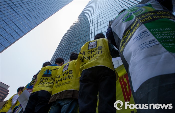 (서울=포커스뉴스)영국과 덴마크에서 옥시레킷벤키저 본사와 케톡스 본사를 항의 방문했던 가습기 살균제 피해자 유족과 시민단체가 11일 오후 서울 영등포구 여의도 옥시 한국본사 앞에서 귀국 기자회견을 갖고 있다.