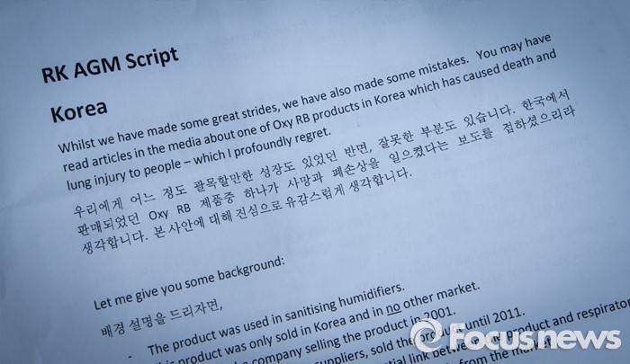 (서울=포커스뉴스)영국과 덴마크에서 옥시레킷벤키저 본사와 케톡스 본사를 항의 방문했던 가습기 살균제 피해자 유족 김덕종(40)씨가 11일 오후 서울 영등포구 여의도 옥시 한국본사 앞에서 열린 귀국 기자회견에서 옥시 본사측의 유감을 표한 문서를 공개하고 있다.
